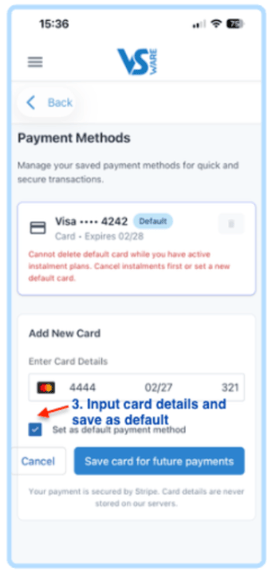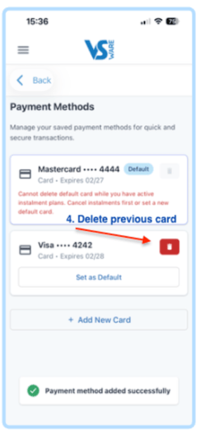 If you have an active instalment subscription, you cannot delete the card linked to that subscription until: